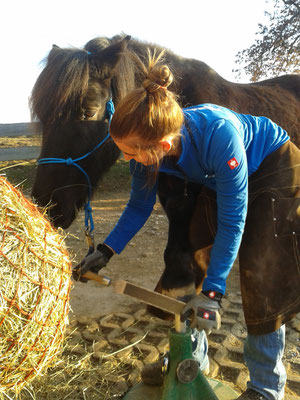 Bei der Hufpflege geht es nicht nur um das regelmäßige kürzen der Hufe, sondern auch darum dem Pferd die problemlose Fortbewegung zu gewährleisten. Eine regelmäßige Hufbearbeitung ist wichtig um den Huf und das Pferd gesund zu erhalten, dabei beachte ich auch Körperbau, Beinstellung und Gang, damit Probleme frühzeitig erkannt werden können oder vorhandene Fehlstellungen korrigiert werden können. Der Bearbeitungsintervall richtet sich individuell nach verschiedenen Faktoren wie z.B. Hornwachstum, Fehlstellung oder körperlicher Einschränkungen (z.B. Arthrose). Deshalb kommen nicht alle Pferde und Ponys mit dem selben Rhythmus zurecht, manche benötigen eine Bearbeitung nach 8 Wochen, andere bereits nach 3 Wochen.